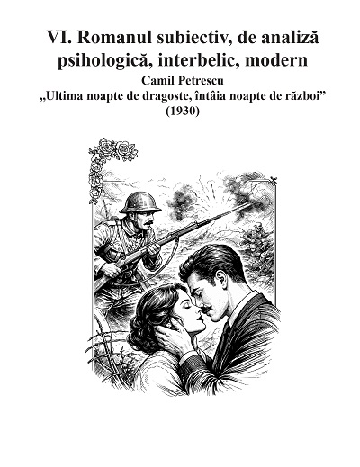 2. Nuvela istorica – Costache Negruzzi, 'Alexandru Lapusneanul' (1840) 3. Nuvela realista, psihologica – Ioan Slavici, 'Moara cu noroc' (1881) 4. Romanul realist, obiectiv, interbelic – Liviu Rebreanu, 'Ion' (1920) 5. Romanul subiectiv, de analiza psihologica, interbelic, modern – Camil Petrescu, 'Ultima noapte de dragoste, intaia noapte de razboi' (1930) 6. Romanul realist, balzacian, interbelic – George Calinescu, 'Enigma Otiliei' (1938) 7. Romanul traditional, interbelic – Mihail Sadoveanu, 'Baltagul' (1930) 8. Comedia – I.L.Caragiale, 'O scrisoare pierduta' (1884) 9. Romanul postbelic – Marin Preda, 'Morometii' (1955, 1967) 10. Teatrul postbelic – Marin Sorescu, 'Iona' (1968) 11. Roman publicat dupa 1980 – Ioan Grosan, 'O suta de ani de zile la portile Orientului'