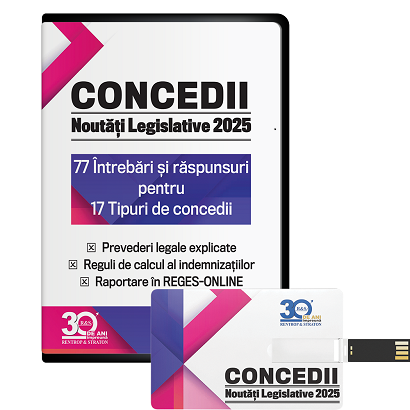 Lucrarea pe stick „77 de intrebari si raspunsuri pentru 17 tipuri de concedii. Noutati legislative” acopera toate modificarile din ultima perioada si va ofera raspunsuri la probleme intalnite in practica de catre angajatori.